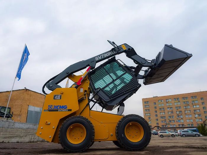 Мини-погрузчик XCMG SV790RU — мощная и универсальная машина с вертикальным подъёмом стрелы, предназначенная для интенсивных работ в строительстве, коммунальной сфере, благоустройстве и переработке отходов. Благодаря увеличенной высоте выгрузки и грузоподъёмности до 1360 кг, он особенно эффективен при загрузке самосвалов и работе с паллетами. Модель комплектуется стандартной гидролинией и линией High Flow (до 142,5 л/мин), что позволяет использовать навесное оборудование с высокими требованиями к потоку и давлению.
